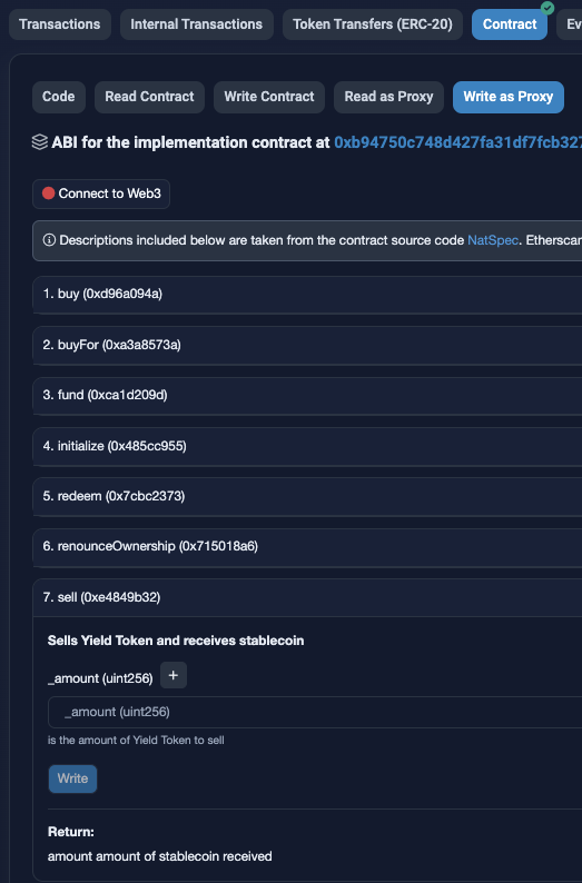 Before redeeming USYC, you must approve the Teller contract to spend your USYC.- Go to the USYC contract and click Write as Proxy.