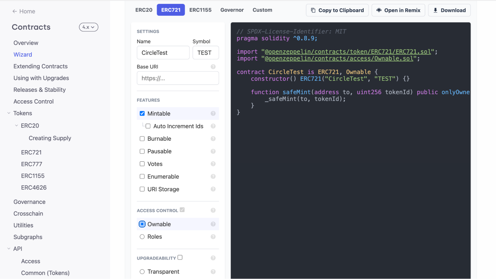 - Select the ERC-721 template and the additional features you want to add to your contract.