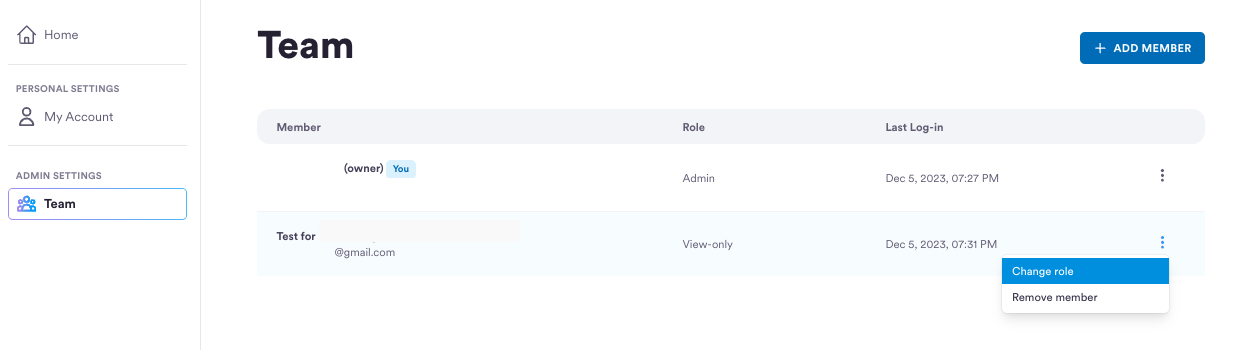 Select the three dots to view the different actions. Select Remove member to remove this user from the account.